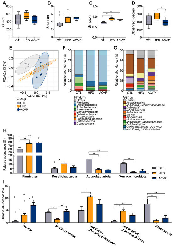 The effect of the intake of apple cider vinegar powder (ACVP) on the gut microbial structure in mice fed with high-fat diets (HFDs). α diversity index (A) Chao 1, (B) Shannon, (C) Simpson, and (D) observed species of intestinal microbiota in each group. (E) Principal coordinate analysis (PCoA) plot. (F) Bacterial taxonomic profiling of the gut microbiota at the phylum and genus (G) levels. (H) Relative abundances of Fimicutes, Desulfobacterota, Actinobacteriota, and Verrucomicrobiota. (I) Relative abundances of Blautia, Muribaculaceae, uncultured_Desulfovibrionaceae, unclassified_Lachnospiraceae, and Akkermansia. Error bars represent mean ± SEM, * p < 0.05, and ** p < 0.01.