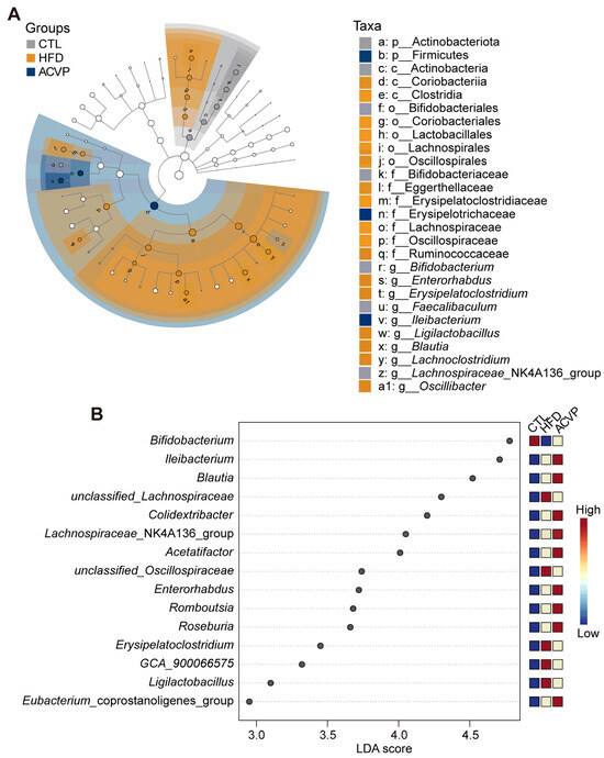 Linear discriminant analysis (LDA) of effect size (LEFSe) identified 15 genera with significant differences among the CTL, HFD, and ACVP groups (LDA score > 2.5). The LDA cladogram (Figure 4A) and score plot (Figure 4B) highlight Bifidobacterium as the most enriched genus in the CTL group, while unclassified_Lachnospiraceae, unclassified_Oscillospiraceae, Erysipelatoclostridium, GCA-900066575, and Ligilactobacillus are significantly increased in the HFD group. ACVP supplementation partially restored these taxa to intermediate levels between CTL and HFD. Notably, genera, such as Roseburia, Eubacterium_coprostanoligenes_group, and Romboutsia, showed a further elevation in ACVP compared to the HFD, suggesting the unique microbial remodeling effect of ACVP intervention.