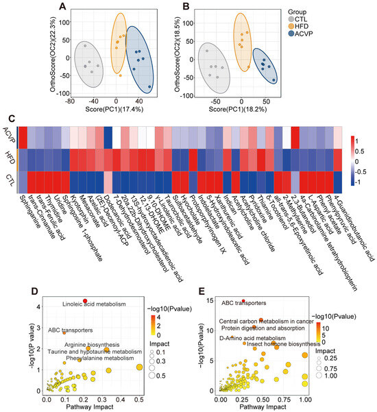 The effects of the intake of apple cider vinegar powder (ACVP) on metabolites of cecal contents in mice fed with high-fat diets (HFDs). Orthogonal partial least squares discriminant analysis (OPLS-DA) score plots of positive-ion (A) and negative-ion (B) modes in mouse cecum metabolites. (C) Heatmap analysis of different metabolites in cecal contents by ACVP. Kyoto encyclopedia of genes and genomes (KEGG) pathway enrichment analysis of differential metabolites in HFD vs. control (CTL) (D) and ACVP vs. HFD (E) mice.