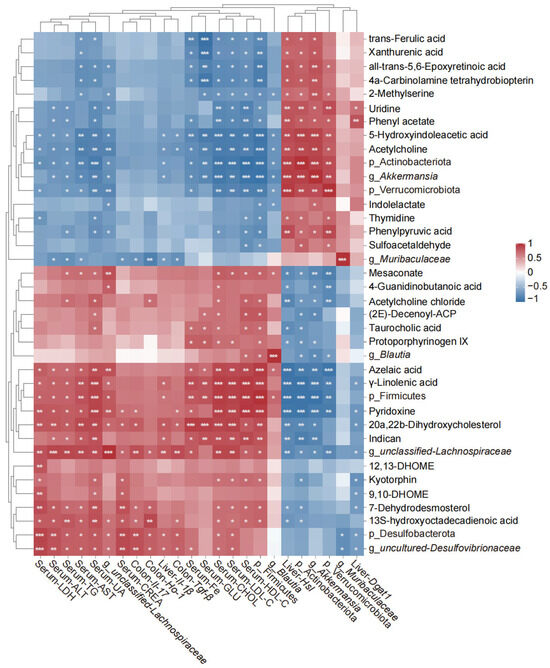 Pearson correlation analysis among the serum biomarkers, liver parameters, colon parameters, gut microbiota, and microbial metabolites in mice fed with three different treatments (control (CTL), high-fat diets (HFDs), and apple cider vinegar powder (ACVP)). Blue represents a negative correlation and red represents a positive correlation. * p < 0.05, ** p < 0.01, and *** p < 0.001.