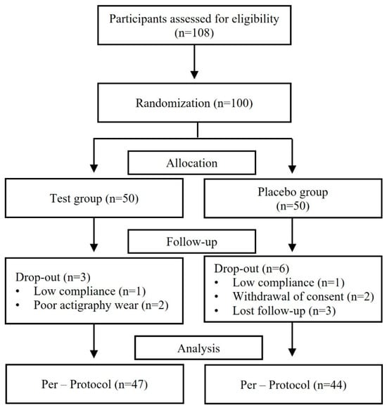 Figure 1 presents the flow chart of the study. A total of 108 participants were screened, with 100 enrolling in the study. Participants were randomly assigned to either the test group (n = 50) or the placebo group (n = 50) during their first visit. Each participant visited the hospital four times: for the screening (2 weeks) and then at 0, 3, and 4 weeks. During the study, three participants in the test group dropped out due to low compliance and inadequate actigraphy wear. In the placebo group, six participants withdrew due to low compliance, withdrawal of consent, and loss of follow-up. Consequently, the data analysis included a total of 91 participants.