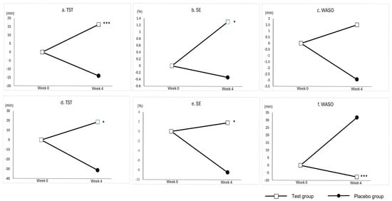 According to PSG measurements, the test group showed longer TST (358.90 ± 19.75 vs. 322.11 ± 17.66 min, p = 0.0457), higher SE (86.86 ± 3.31 vs. 79.60 ± 2.99%, p = 0.0182), and shorter WASO (39.26 ± 10.57 vs. 68.15 ± 9.60 min, p = 0.0042) compared to the placebo group.