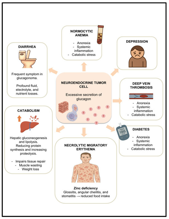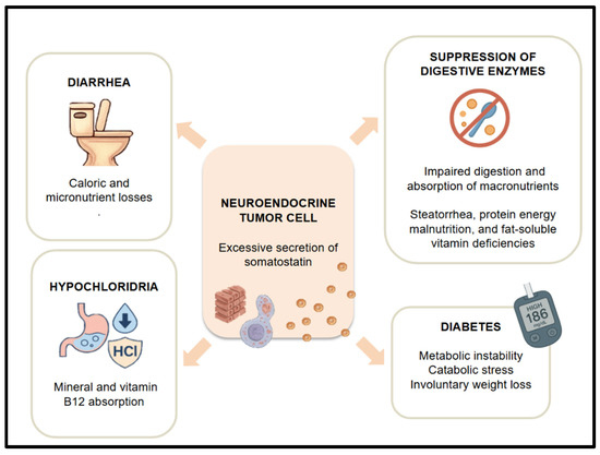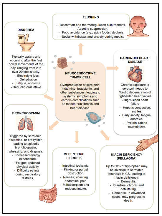 Nutritional deterioration in patients with GEP-NENs arises from multiple factors; however, up to 30% of cases present with hormone-related syndromes at diagnosis, further exacerbating gastrointestinal and metabolic complications [