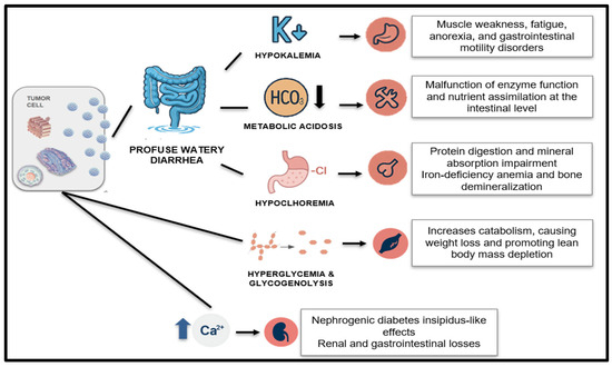 VIPomas are rare functional neuroendocrine tumors characterized by the overproduction of vasoactive intestinal peptide (VIP), with an estimated incidence of 0.05 to 0.2 cases per million people per year, resulting in a distinct clinical syndrome often referred to as WDHA (watery diarrhea, hypokalemia, and achlorhydria). The most prominent manifestation is severe secretory diarrhea, which may reach volumes of 6 to 8 L per day, leading to profound fluid and electrolyte losses, particularly potassium and bicarbonate. In severe cases, these pathophysiological disturbances can result in malnutrition, cachexia, and the need for parenteral fluid and nutritional support. The nutritional consequences are further exacerbated by anorexia, nausea, and generalized weakness associated with chronic electrolyte imbalances. Therefore, early and aggressive management of VIPoma-related symptoms is essential not only for hormonal control but also to prevent or reverse the rapid decline in nutritional and functional status [