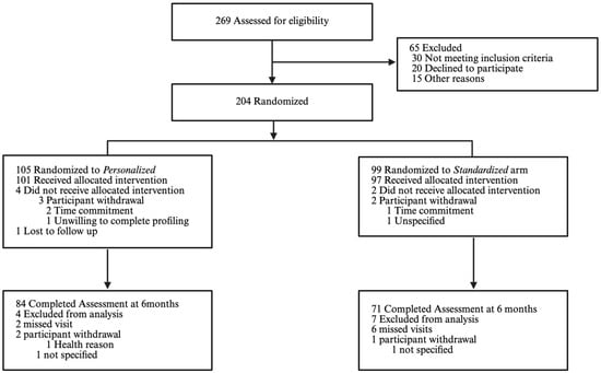 This secondary analysis was based on 155 participants (Personalized: n = 84 vs. Standardized: n = 71) with complete baseline data (mean [standard deviation]: age, 59 [10] years; 66.5% female; 56.1% White; 23.1% African American, BMI 33.4 [4.6] kg/m2; HbA1c: 5.8 [0.59] %). There were no significant differences in baseline characteristics (Table 1), except that those randomized in the Standardized arm had a slightly lower BMI (Standardized BMI: 32.6 [4.22] kg/m2 vs. Personalized BMI: 34.2 [4.82] kg/m2, p = 0.03). Additionally, there was a difference in the distribution of sexes between the Standardized and Personalized arms that was approaching significance. Figure 1 shows the flow of participants.
