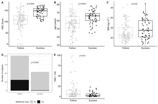 Figure 2. The top five baseline predictors of weight-loss success in the combined sample. Success was defined as those who achieved ≥5% weight loss at 6 months, whereas failure was defined as those with <5% weight loss. (A) Weight-loss self-efficacy (WEL) score (p < 0.0001); (B) age at study visit in years (p < 0.0001); (C) body mass index (BMI, p = 0.08); (D) number of participants on metformin at randomization (p < 0.0001); and (E) glycemic variability measured as time above range (>140 mg/dL, TAR>140 (p = 0.03).