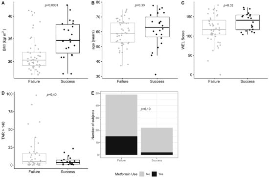 Figure 3. The top five baseline predictors of weight-loss success in the Standardized arm. Success was defined as those who achieved ≥5% weight loss at 6 months, whereas failure was defined as those with <5% weight loss. (A) Body mass index (BMI, p < 0.0001); (B) age at study visit in years (p = 0.3); (C) weight-loss self-efficacy (WEL) score (p = 0.02); (D) glycemic variability measured as time above range (>140 mg/dL, TAR>140 (p = 0.4); and (E) number of participants on metformin at randomization (p = 0.10).