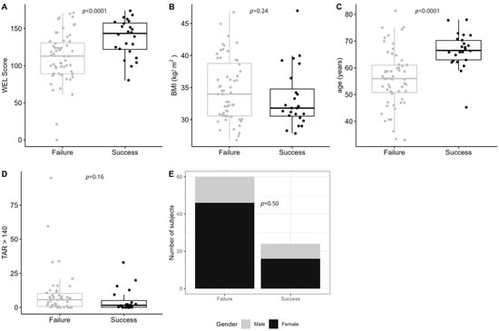 Comparing individuals who achieved successful weight loss at 6 months to those who did not (i.e., failure), of the five baseline characteristics, all were significantly different except for BMI (p = 0.08, Figure 2A–E).
