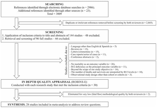 Longitudinal, observational studies carried out in clinical or epidemiological scenarios, in humans aged ≥18 years with high serum levels of vB12 and in which the outcome variable was all-cause mortality, as well as adjusted HR values were reported. Publications included those written in the English and Spanish language.