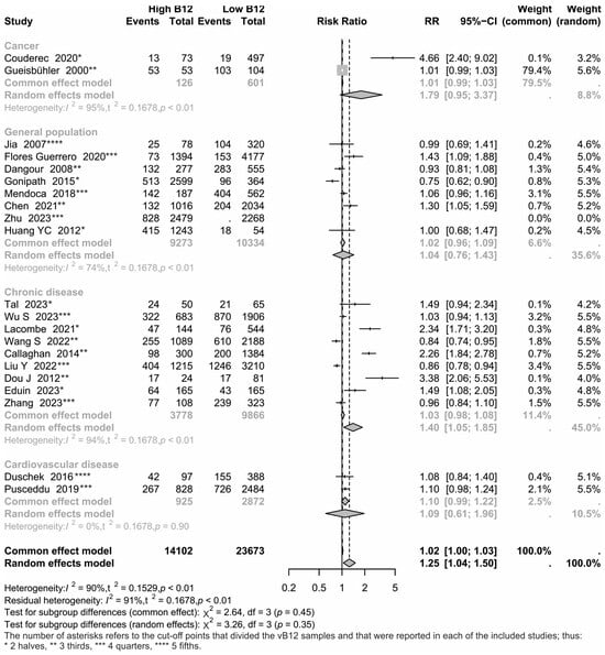 On the contrary, a 2024 dose-response meta-analysis [31] shows that hypervitaminosis B12 (≥542 pg/mL) is positively associated with all-cause mortality risk, particularly among older adults (aHR = 1.5; 95% CI 1.29 to 1.74, I2 = 81.8%; n = 10). These findings are based on 18 longitudinal studies comprising 53,468 subjects and 10,244 all-cause deaths. Nevertheless, sources of variation among study results (e.g., variety of different follow-up periods, distinct vB12 cut-off points, vB12 quantified at a single moment in time, among others) are not identified, nor is their impact on effect size quantified using meta-regression or an analysis of variance. In addition, vB12 concentrations are categorized inconsistently, which lead to misleading conclusions. Further, a statistically significant linear trend test does not indicate the presence of a monotonic relation [40].