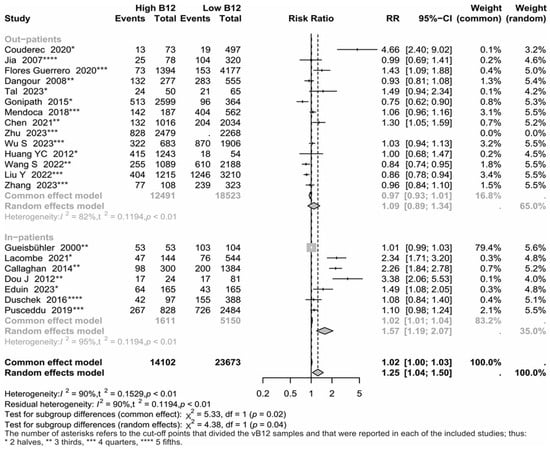 Twenty studies were used because they included all necessary information for the present analyses. Significant heterogeneity was observed ( = 89.7%; variance estimated of 0.1529; Q = 184.51; p < 0.001). Thus, a random-effects model was used. The RR estimated was 1.25 (95% CI = 1.04 to 1.50), which indicated that the individuals with high B12 levels were 1.25 more likely to die than those with normal B12 levels.
