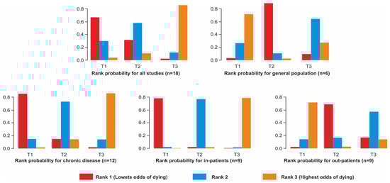 For in-hospital-based studies, T1 had a rank of 1 (less likelihood of dying) in 97.37% of the simulations, while there was a higher percentage to belong to rank 3 for T3, 97.80%. Additionally, when considering comparisons with T1, there was a significant difference between T1 and T3, OR = 16 (95% credibility interval 4.5 to 83), but no significant difference between T1 and T2, OR = 3.3 (95% credibility interval 1 to 19). When the SUCRA score was considered, T1 had the highest score (0.986).