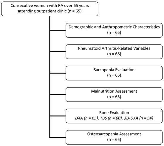 This cross-sectional, observational, exploratory study enrolled female participants aged over 65 years who fulfilled the 2010 ACR classification criteria for RA, as assessed during routine clinical follow-up at a university-affiliated tertiary care rheumatology unit. Patients with conditions that could significantly influence nutritional or functional status—such as malignancies, decompensated cardiac or respiratory disease, or chronic hepatic or renal failure—were excluded. An overview of the study flow and data collection process is provided in Figure 1.