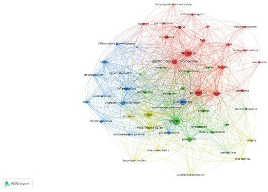 To ascertain the predominant research domains in the literature concerning probiotics, postbiotics, and gut microbiota, a co-occurrence analysis of keywords was performed using VOSviewer software. This analysis encompassed the terms present in the titles and abstracts of the publications selected for review. The findings are shown in Figure 1. The resulting map revealed four distinct thematic clusters, illustrating the interdisciplinary nature of the study area. The red cluster is centred on clinical research involving humans. Dominant terms, such as humans, gastrointestinal microbiome, microbiota, probiotics, females, and males, indicate a broad interest in the impact of gut microbes on human health, including sex differences and intervention designs (e.g., the double-blind method). The blue cluster encompasses inflammatory and immune-related topics of research. The presence of terms such as inflammatory bowel disease, colitis, oxidative stress, and inflammation confirms the significance of preclinical research in analysing the mechanisms of action of probiotics and postbiotics in the context of gastrointestinal pathology. The green cluster represents the domain of animal experiments. The frequent co-occurrence of terms such as animals, mice, gut microbiota, postbiotics, and dietary supplements indicates the use of animal models to assess the function and efficacy of microbiological interventions. The yellow cluster focused on the biotechnological aspects of formulations and active ingredients. Terms such as Lactobacillus plantarum, cytokines, lipopolysaccharides, and obesity reflect the interest in specific bacterial strains, their metabolites, and their effects on metabolic and immunological parameters of obesity. Many studies on probiotics, postbiotics, inflammation, and the gastrointestinal microbiome have confirmed the centrality of these issues in the current scientific discourse. The density of connections and overlapping clusters suggests an intense integration of clinical, experimental, and technological perspectives.