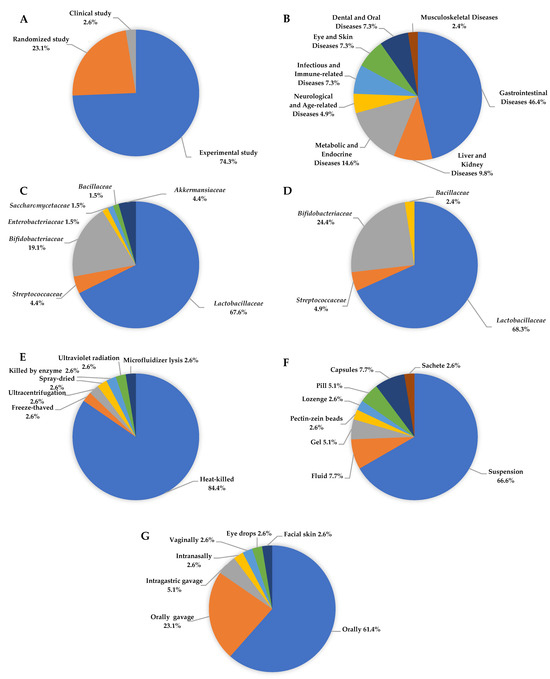 Characteristics of postbiotics used in research on inflammatory disease: (A) Study design, (B) type of disease, (C) single-strain postbiotics, (D) multiple-strain postbiotics, (E) method of inactivation, (F) forms of postbiotics formulation, (G) postbiotics applications method.