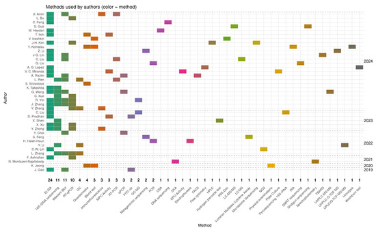 Figure 4 illustrates the research methodologies employed by the authors in the publications analysed from 2019 to 2024. The figure presents a heat map where each rectangle’s colour corresponds to a specific analytical or molecular method, and the vertical axis lists the authors’ names organised by the year of publication. Among the techniques used, ELISA emerged as the most frequently employed method, appearing in 24 publications, underscoring its significance in quantifying cytokines and other immune biomarkers in studies on microbiota, probiotics, and postbiotics. Other prevalent methods included 16S rDNA sequencing, featured in 11 publications, which is extensively used to examine gut microbiota composition, and Western blotting, featured in 11 publications, primarily for detecting signalling proteins linked to inflammation or immune response. RT-qPCR and qPCR were used in four studies to assess gene expression and the presence of bacterial genetic material. The remaining methods appeared sporadically in only one or two publications and encompassed highly specialised techniques, such as LC-MS/MS, UPLC-Q-TOF-MS, metagenomic sequencing, SMRT sequencing, microbiome assays, and spectrophotometry. This diversity of methods reflects a broad spectrum of research approaches, ranging from classical immunological analyses to advanced omics techniques, including metabolomics, metagenomics, and transcriptomics. A notable increase in unique techniques was observed in 2023–2024 publications, indicating escalating research complexity and advancing methodological specialisation. Integrated analytical approaches that combine molecular methods with metabolite profiling and next-generation sequencing are becoming increasingly prevalent. The analysis of research methodologies revealed a predominance of techniques related to immunology and microbiota analysis, such as ELISA and 16S rDNA, while also expanding the methodological spectrum toward advanced molecular and omics analyses. This trend suggests a growing need for multilevel analyses of the intricate interactions between probiotics, microbiota, and host responses.