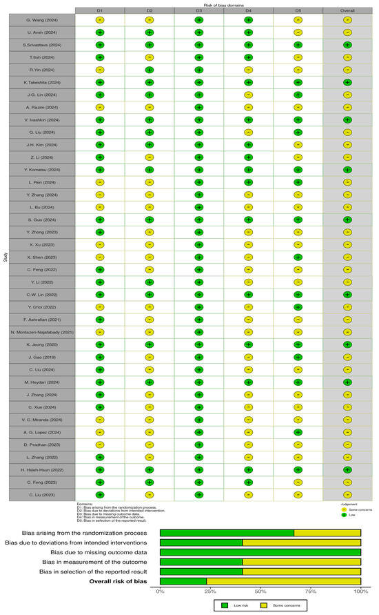 The overall risk of bias found in the included studies raises doubts about the reliability of the results presented. Although all studies showed a low risk of bias related to missing outcome data, other domains showed significant methodological shortcomings. The process of random sequence generation was not consistently reported, and only 26 studies provided clear information on allocation concealment. The majority of studies showed some concern or high risk for deviations from the intended interventions, which may have affected the internal validity of the results. In addition, only 16 studies reported a low risk of bias in outcome measurement, and the risk of selective reporting remained unclear in many cases. These issues suggest that although some methodological aspects were adequately addressed, caution should be exercised when interpreting results.