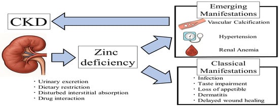 Zinc serves as an essential cofactor for the activity of approximately 300 zinc-containing enzymes, including DNA polymerase, RNA polymerase, alcohol dehydrogenase, carbonic anhydrase, and superoxide dismutase (SOD) [36,37]. Bioinformatics research suggests that approximately 2800 human proteins may function as zinc-binding proteins [38]. In addition to traditional symptoms of zinc deficiency such as taste impairment [39], anorexia and loss of appetite [40], dermatitis [41], delayed wound healing [42], and infection [43], other clinical manifestations including vascular calcification, hypertension, and renal anemia, have been increasingly recognized in patients with CKD [44] (Figure 1). These emerging features of zinc deficiency are associated with adverse outcomes, including progressive kidney dysfunction, cardiovascular disease (CVD) events, and increased mortality. Regarding other trace elements, including magnesium and selenium, low serum levels of these elements have been consistently associated with CKD progression in pre-dialysis patients [45,46,47], as well as with all-cause mortality in patients undergoing hemodialysis [48,49]. However, evidence regarding the association between serum zinc levels and these clinical outcomes remains relatively limited.