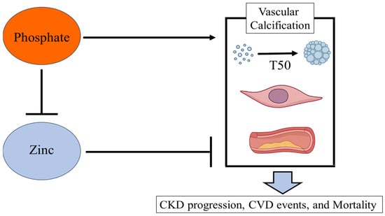 Since zinc deficiency is common in patients with CKD, the inhibitory effects of zinc on hydroxyapatite formation (i.e., prolongation of T50) and the suppression of calcification-related transcription factors may be impaired in patients with CKD. Findings from basic research on zinc in relation to VSMCs and T50, along with clinical studies on zinc and markers of vascular calcification and atherosclerosis, suggest that zinc could help suppress the progression of CKD, CVD events, and mortality by preventing phosphate-induced calcification (Figure 2). Further clinical trials are warranted to determine whether zinc supplementation can improve T50 and/or attenuate vascular calcification in patients with CKD and those undergoing hemodialysis.