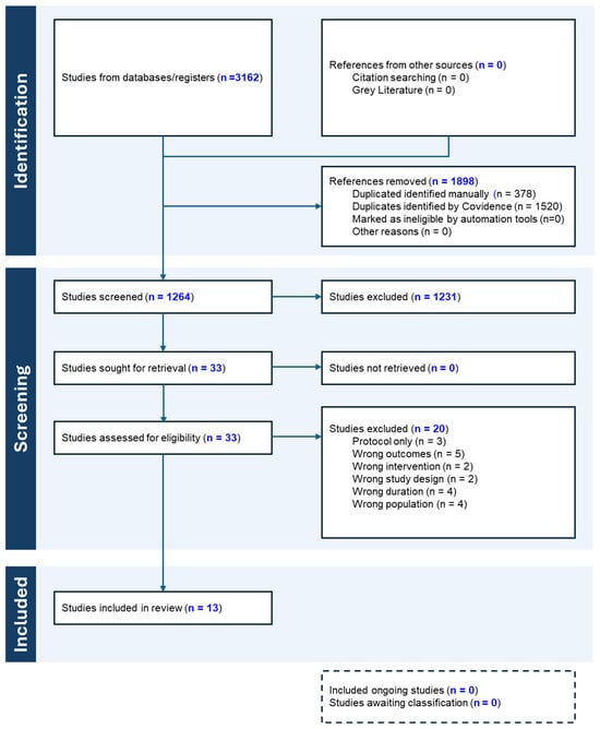 A systematic search was conducted across four databases (PubMed, Scopus, Web of Science, and Cochrane Library), yielding 3162 articles, of which 1898 duplicates were excluded. After the removal of duplicates, 1264 articles underwent title and abstract screening. Of these, 33 studies qualified for full-text assessment, resulting in the inclusion of 13 RCTs. The study selection process is detailed in the PRISMA flow diagram (Figure 1).