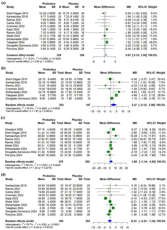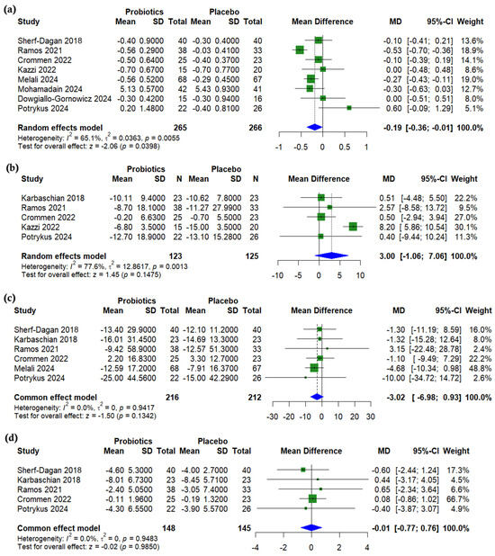 A pooled analysis showed a significant reduction in HbA1c in the probiotics group compared to a placebo after bariatric surgery (MD = −0.19%, 95% CI (−0.36 to −0.01), p = 0.0398, I2 = 65.1%) (Figure 4a). The level of fasting insulin was non-significantly higher with probiotics (MD = 3.00 µU/mL, 95% CI (−1.06 to 7.06), p = 0.1475, I2 = 77.6%) (Figure 4b). No significant differences were found for fasting blood glucose (MD = −3.02 mg/dL, 95% CI (−6.98 to 0.93), p = 0.134, I2 = 0%) (Figure 4c) or HOMA-IR (MD = −0.01, 95% CI (−0.77 to 0.76), p = 0.985, I2 = 0%) (Figure 4d). A sensitivity analysis for HbA1c showed that the exclusion of Ramos (2021) [26] reduced the level of heterogeneity (I2 = 29.8%, p = 0.201) (Supplementary Figure S10). The level of heterogeneity in insulin was resolved (I2 = 0%) with the exclusion of Kazzi (2021) [27] (Supplementary Figure S11).