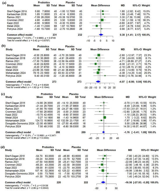 A pooled analysis showed no significant differences between probiotics and a placebo after bariatric surgery for HDL cholesterol (MD = 0.38, 95% CI (−1.41 to 2.17), p = 0.676, I2 = 0%) (Figure 3a), LDL cholesterol (MD = −4.07, 95% CI (−8.98 to 0.84), p = 0.104, I2 = 0%) (Figure 3b), or total cholesterol (MD = −1.76, 95% CI (−5.41 to 1.89), p = 0.344, I2 = 10.5%) (Figure 3c). However, triglycerides were significantly lower in the probiotics group (MD = −16.56, 95% CI (−27.93 to −5.20), p = 0.004, I2 = 0%) (Figure 3d).