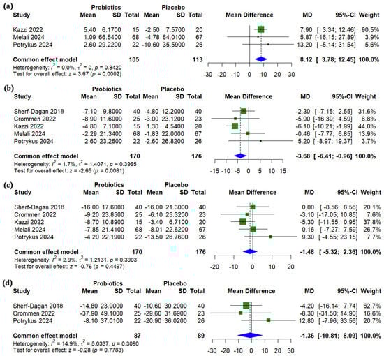 A pooled analysis of body mass index (BMI) showed a significant reduction in the probiotics group compared to a placebo (with a mean difference (MD) of 0.67, 95% CI (0.33 to 1.00), p < 0.001, I2 = 12%) (Figure 2a). On the other hand, no significant differences were observed between groups for waist circumference (MD = 2.47, 95% CI (−0.12 to 5.06), p = 0.062, I2 = 75.0%) (Figure 2b), % excess weight loss (%EWL) (MD = 1.89, 95% CI (−1.14 to 4.92), p = 0.221, I2 = 65.2%) (Figure 2c), or % total weight loss (%TWL) (MD = −0.43, 95% CI (−2.21 to 1.34), p = 0.632, I2 = 75.7%) (Figure 2d). A leave-one-out sensitivity analysis showed that the exclusion of Ghafouri-Taleghani (2024) [20] reduced heterogeneity in waist circumference change (I2 = 45.4%, p = 0.103) (Supplementary Figure S2). The exclusion of Kazzi (2021) [27] notably reduced the heterogeneity of the %TWL (I2 = 35.4%, p = 0.135) (Supplementary Figure S3).