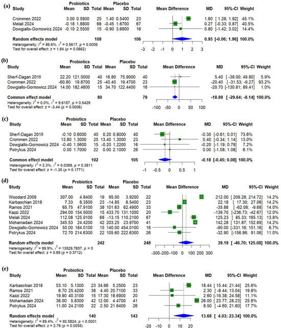 Albumin levels were slightly higher with probiotics compared to placebo, but the difference was not statistically significant (MD = 0.95 µmol/L, 95% CI (−0.06 to 1.96), p = 0.066, I2 = 86.6%) (Figure 6a). Ferritin levels were significantly lower with probiotic use (MD = −18.89 µg/L, 95% CI (−29.64 to −8.14), p < 0.001, I2 = 0.0%) (Figure 6b), while no significant differences were observed in hemoglobin (MD = −0.18 g/dL, 95% CI (−0.45 to 0.08), p = 0.177, I2 = 2.2%) (Figure 6c) or vitamin B12 levels (MD = 39.19 nmol/L, 95% CI (−46.70 to 125.08), p = 0.371, I2 = 99.9%) (Figure 6d). In contrast, vitamin D levels were significantly higher in the probiotics group (MD = 13.68 pg/mL, 95% CI (4.03 to 23.34), p = 0.005, I2 = 89.4%) (Figure 6e). A sensitivity analysis revealed that the heterogeneity in both vitamin B12 and vitamin D levels could not be resolved by omitting individual studies (Supplementary Figures S12 and S13). For albumin, a sensitivity analysis showed that omitting either Crommen 2022 [25] or Melali 2024 [24] resolved the heterogeneity, which decreased from 86.6% to 0% (p = 0.354 and 0.554, respectively) (Supplementary Figure S14).