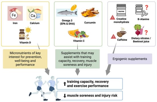 The use of bioactive compounds and dietary supplements among adolescent athletes is a growing phenomenon, driven by the desire to optimize performance, recovery, and overall athletic development [3,4,5,15]. Despite the increasing popularity of ergogenic aids in this age group, the available scientific literature remains limited and, in many cases, inconclusive. As shown in Figure 1, dietary supplements can be broadly categorized into micronutrients essential for health, compounds that may support training capacity and recovery, and ergogenic aids with performance enhancing potential.