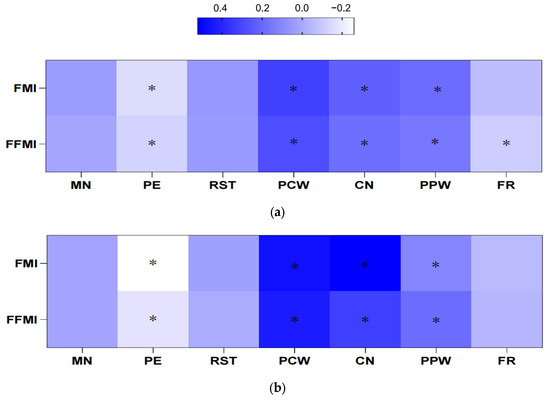 Pearson’s correlations between CFQ factors and body composition in two regions. Abbreviations: FMI: Fat mass index; FFMI: Fat free mass index. MN: Monitoring; PE: Pressure to eat; RST: Restriction; PCW: Percived child weight; CN: Concern about child weight; PPW: Percived parent weight; FR: Food as reward. *: p < 0.05. (a) Yulin, (b) Shenzhen.