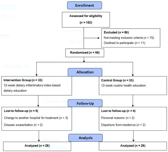 One hundred and fifty-two CRC patients were screened, of whom 75 (49.4%) did not meet the eligibility criteria, 11 (7.2%) refused participation, and the remaining 66 frail CRC patients were randomly assigned to either the intervention group or control group, with 33 participants in each group. During the period of the study, three participants in the intervention group changed hospitals for treatment and two participants withdrew due to exacerbation. In the control group, two participants left their place of residence and two withdrew for personal reasons. Thus, after 12 weeks of intervention, data were collected from 57 participants (28 in the intervention group and 29 in the control group). One participant in the control group refused to provide blood samples, so 28 participants in each group underwent measurement of plasma inflammatory markers. The flow diagram of the study is shown in Figure 1.