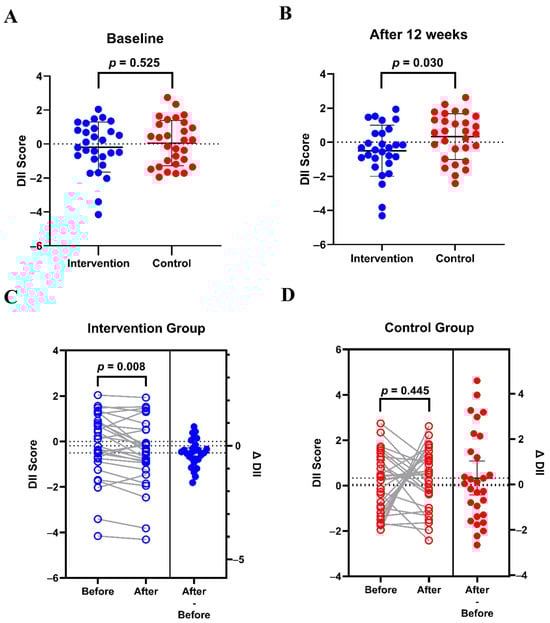 At baseline, the DII scores between the control and intervention groups of frail CRC patients were not significantly different (p = 0.525; Figure 3A). After the 12-week intervention, the intervention group showed significantly lower DII scores compared to the control group (–0.50 ± 1.49 vs. 0.33 ± 1.33; p = 0.030; Figure 3B). DII scores in the intervention group were significantly decreased compared with the baseline (∆ DII = –0.32 ± 0.59; p = 0.008; Figure 3C), whereas the control group exhibited a non-significant increase in DII scores compared with the baseline (∆ DII = 0.28 ± 1.96; p = 0.445; Figure 3D).