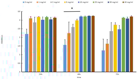 The viability of skeletal muscle differentiation cells (SOL8) under different concentrations and times of Tartary buckwheat oligopeptides was evaluated by the CCK-8 method. As shown in Figure 1, when the concentration of Tartary buckwheat oligopeptides was 0–40 mg/mL, the cell viability showed an approximately increasing trend with the extension of intervention time, indicating that Tartary buckwheat oligopeptides did not affect the cell activity of SOL8 and had no toxic effects on cells within this concentration range. Considering the effects of concentration and time, a concentration of 10 mg/mL of Tartary buckwheat oligopeptides was selected for continuous experiments lasting 48 h (compare with 0 mg/mL, p < 0.05).