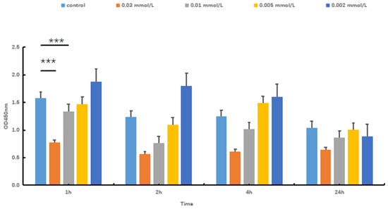 Hydrogen peroxide (H2O2) is capable of directly oxidizing lipids and proteins. Additionally, it can permeate the cell membrane via chemical reactions, thereby accumulating free radicals. This process ultimately results in cellular damage. To establish a model of oxidative stress injury in SOL8, different concentrations of H2O2 were used to evaluate the cytotoxicity to select an appropriate concentration. The results showed that H2O2 is capable of decreasing SOL8 cell viability in a dose-dependent manner (Figure 2). The CCK-8 value of the 0.01 mol/L H2O2 group was significantly lower than that of the control group after 1 h of cell damage (p < 0.001), and the cell survival rate was significantly higher than that of the 0.03 mol/L H2O2 group. Considering the intervention dose and time, an H2O2 concentration of 0.01 mol/L for 1 h was used to establish a model of oxidative stress injury in SOL8.