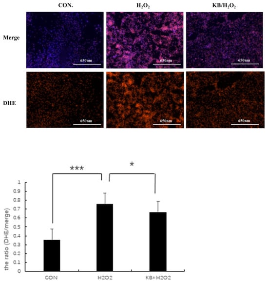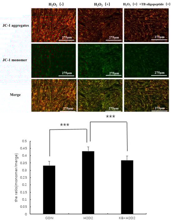 Mitochondria in cells are one of the important organelles in the body. As the main site of aerobic respiration in cells, they are commonly used in the study of early cellular oxidative stress and apoptosis. Mitochondrial activity is associated with aging and diseases, and changes in mitochondrial membrane potential are often used as an important detection index. JC-1 is a membrane-permeable dye widely used in flow cytometry and fluorescence microscopy to measure mitochondrial membrane potential. When the mitochondria are normal and the membrane potential difference remains unchanged, JC-1 will aggregate and emit red fluorescence. When the membrane potential decreases, JC-1 will emit green fluorescence as a monomer, and the ratio of the two can be used as an indicator to detect the state of mitochondria. As shown in Figure 6, compared with the CON group, the ratio (the ratio of green fluorescence to total fluorescence intensity) in the H2O2 group significantly increased (p < 0.001), and the mitochondrial membrane potential in the KB/H2O2 group tended to return to the level of the CON group, with the ratio (the ratio of green fluorescence to total fluorescence intensity) significantly lower than that in the H2O2 group (p < 0.001).