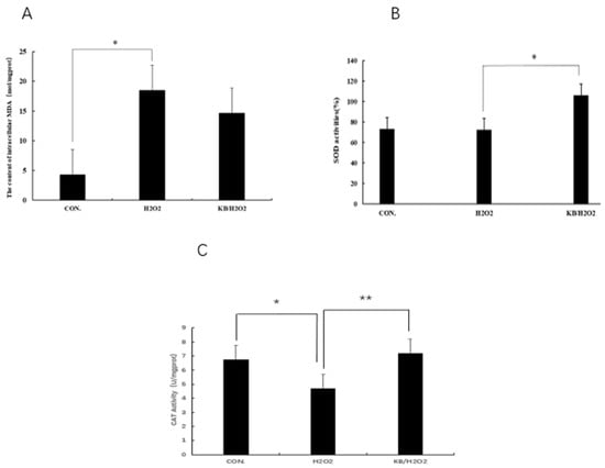 ROS can easily react with lipids through double bonds, leading to cell membrane degradation and the production of lipid oxidation products such as MDA. Therefore, the content of MDA can reflect the degree of oxidative damage in cells. As shown in Figure 5A, the MDA content in the H2O2 group was significantly higher than that in the CON group (p < 0.05), and the MDA content in the KB/H2O2 group was 11.5% lower than that in the H2O2 group. Tartary buckwheat oligopeptides have a protective effect on the oxidative stress of SOL8 cells, possibly by increasing the activity of antioxidant enzymes and reducing the level of lipid oxidation in cells, which is conducive to maintaining cellular redox homeostasis. Superoxide dismutase (SOD) is a widely existing antioxidant enzyme in living organisms and plays a key role in the balance of oxidation and antioxidant in the body. After intervention with H2O2, the activity of SOD in cells was decreased, and the SOD activity in the KB/H2O2 group was significantly higher than that in the H2O2 group (p < 0.05), which can inhibit inflammation and apoptosis mediated by intracellular signals (Figure 5B). Catalase (CAT) is an enzyme that can decompose hydrogen peroxide into water and oxygen, protecting cell components such as proteins and DNA from hydrogen peroxide attack and, thus, protecting cells from damage. The activity of CAT (Figure 5C) in the H2O2 group was significantly lower than that in the CON group (p < 0.05), and the activity of CAT in the KB/H2O2 group was significantly higher than that in the H2O2 group (p < 0.01). CAT and SOD, as antioxidant enzymes in the antioxidant system within living organisms, both convert active substances into harmless substances, thereby protecting cells from oxidative damage.