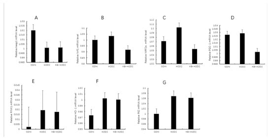 As shown in Figure 7A–G, compared with the CON group and the KB/H2O2 group, the mRNA expression of KEAP1 in the H2O2 group was decreased. Since the activity of KEAP1 was resisted, NRF2α was no longer ubiquitinated and degraded, thus accumulating and transferring to the nucleus to activate the expression of antioxidant genes. Therefore, the mRNA expression of NRF1 and NRF2α in the H2O2 group was higher than that in the CON group and the KB/H2O2 group. HO-1, as a downstream target gene of NRF2, had higher mRNA expression in the H2O2 group than in the CON group and the KB/H2O2 group. The metabolites of HO-1 can further regulate the expression of PGC-1 through stimulating signaling pathways; therefore, as shown in Figure 7D,F, the mRNA expression of HO-1 and PGC-1 in the H2O2 group was higher than that in the CON group and KB/H2O2 group. P62 binds to KEAP1 to further promote the release and nuclear translocation of NRF2. The mRNA expression of P62 in the H2O2 group was higher than that in the control group and the intervention group (Figure 7G). As depicted in Figure 7E, H2O2 in the PINK-1 group increased, while that in the KB/H2O2 group decreased. However, these changes did not reach statistical significance.