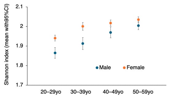 The Shannon index values (mean [95% CI]) were as follows: males 20–29 years (n = 268), 1.86 [1.84–1.89]; males 30–39 years (n = 253), 1.91 [1.88–1.94]; males 40–49 years (n = 221), 1.97 [1.94–2.00]; males 50–59 years (n = 179), 2.00 [1.98–2.03]; females 20–29 years (n = 878), 1.94 [1.93–1.96]; females 30–39 years (n = 301), 2.00 [1.98–2.02]; females 40–49 years (n = 336): 2.02 [2.00–2.03]; females 50–59 years (n = 307), 2.03 [2.02–2.05] (Figure 1).