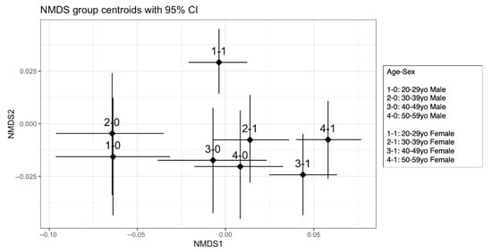 NMDS is a method of compressing high-dimensional data to a lower dimension while preserving the relative distances between individuals. In other words, it preserves only the greater or lesser distances and ignores the absolute distances between individuals. This makes it possible to investigate patterns in the data in nonmetric spaces. Figure 2 shows that the centroids with 95% CIs in the age–sex groups are displayed in the NMDS. From the visualized figures, women in their 20s and women in their 30s, 40s, and 50s; men in their 20s or 30s; men in their 40s and 50s; men and women in their 20s; and men and women in their 30s were visibly distant from each other. Thus, although a causal relationship is not known, dietary patterns may exist when individuals are grouped by age and sex.