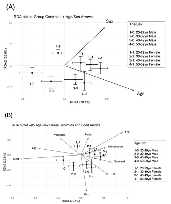 All multivariate analyses were conducted via R software (version 4.5.0 (2025-04-11); The R Foundation for Statistical Computing, Vienna, Austria) and RStudio (version 2025.05.0+496). The following packages were used: vegan (v2.6-4) for RDA, boot (v1.3–28.1) for bootstrap estimation, dplyr (v1.1.2) for data manipulation, and ggplot2 (v3.4.2) and ggrepel (v0.9.3) for data visualization. The dietary intake data for 10 food groups were standardized via Z score transformation and used as dependent variables. The RDA model was constructed with ‘rda(Y~Age + Sex)’, and sample scores (scaling = 2) were extracted. Group centroids based on age–sex combinations were computed via 2000 bootstrap replicates (boot package), and 95% confidence intervals were defined as the 2.5th and 97.5th percentiles. The RDA biplot was created via ‘ggplot2’, visualizing both sample scores (sites) and food loadings (species) with scaling adjustment (e.g., multiplied by 0.3–2.5 for clarity). The arrows indicate food contributions, and the group centroids are overlaid with confidence intervals. In some plots, the biplot scores of explanatory variables (from ‘display = “bp”’) were also visualized as vectors to illustrate the influence of age and sex. Data are represented as centroids of the median with 95% CI.