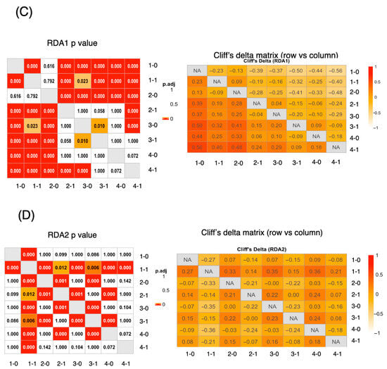 To assess between-group differences along the first and second RDA axes (RDA1 and RDA2), Kruskal–Wallis tests were first conducted. When significant differences were found, post hoc comparisons were performed via Dunn’s test with Bonferroni correction (‘dunnTest()’ function from the ‘FSA’ package). In addition to p values, effect sizes were calculated via Cliff’s delta for all pairwise group comparisons (‘cliff.delta()’ function from the ‘effsize’ package). This nonparametric metric quantifies the magnitude of the difference and provides 95% confidence intervals. The results were d in matrix heatmaps to highlight both the direction and magnitude of the effects. p < 0.05 was considered to indicate statistical significance. According to Romano et al. (2006), the magnitude of Cliff’s delta (|δ|) can be interpreted as follows: values between 0.00 and 0.147 indicate a negligible effect, values from 0.147 to 0.33 represent a small effect, values from 0.33 to 0.474 indicate a medium effect, and values equal to or greater than 0.474 are considered large effects [].