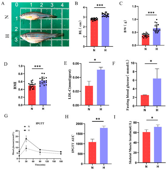 High-fat diet induces obesity and type 2 diabetes in zebrafish. (A) Representative images comparing body morphology between the N and H groups. (B) Body length of zebrafish after 8-week HFD intervention. (n = 18); (C) body weight of zebrafish (n = 18); (D) body mass index of zebrafish (BMI, n = 18); (E) skeletal muscle low-density lipoprotein cholesterol levels (n = 3). (F) Fasting blood glucose levels (n = 3). (G) IPGTT curves (n = 3). (H) AUC of IPGTT. (I) Skeletal muscle insulin content (n = 3). * p < 0.05, ** p < 0.01, *** p < 0.001.