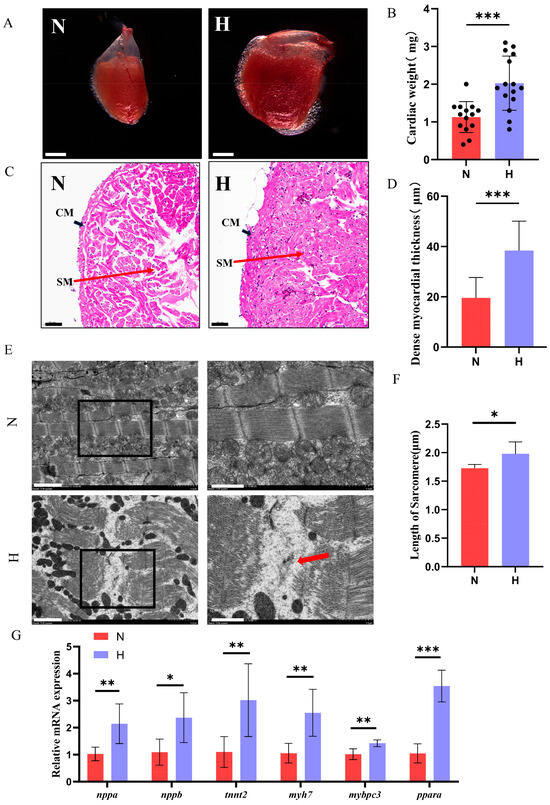 To investigate whether T2DM induces pathological cardiac remodeling, stereomicroscopic analysis revealed significantly enlarged hearts in the H group compared to the controls, with increased heart weight (Figure 2A,B). H&E staining demonstrated an expanded maximum longitudinal cross-sectional area and a thickened compact myocardium in HFD-fed zebrafish (Figure 2C,D). Electron microscopy further identified disrupted myofibrillar architecture and elongated sarcomere lengths in HFD hearts (Figure 3E,F). RT-qPCR analysis showed marked upregulation of cardiac stress markers (nppa, nppb), contractile dysfunction-related genes (myh7, tnnt2, mybpc3) and a gene related to fatty acids metabolism (ppara) in the H group (Figure 2G), consistent with pathological hypertrophy and cardiomyopathy progression [24]. These results indicated that T2DM can lead to pathological changes in zebrafish hearts.