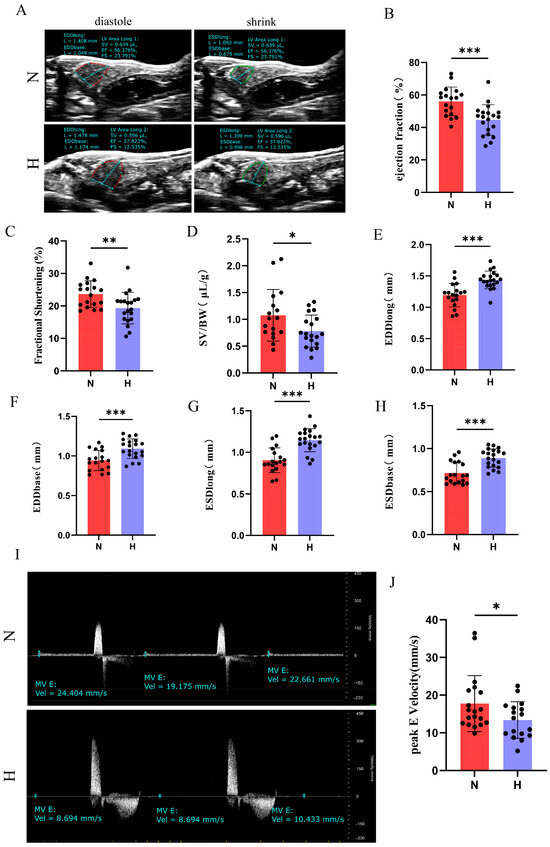 Cardiac functional assessment via echocardiography revealed significant reductions in EF, FS, SV normalized to body weight (SV/BW), and E peak in the H group (Figure 3A–D,I,J). Concurrently, EDDlong, ESDlong, EDDbase, and ESDbase significantly increased (Figure 3E–H), indicating ventricular dilation accompanied by impaired systolic and diastolic function. Collectively, these findings demonstrate that 8-week HFD intervention induces pathological cardiac hypertrophy and functional deterioration in zebrafish.