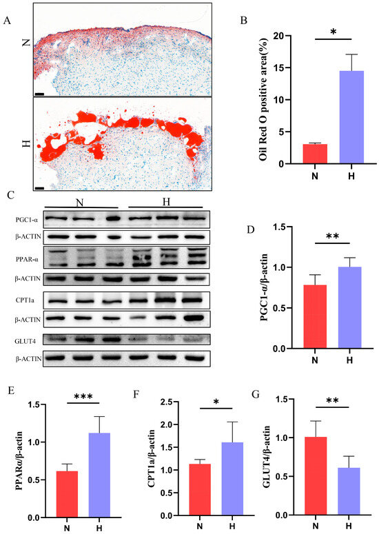 Cardiac energy metabolism relies on the balanced utilization of lipids and glucose, with dysregulated substrate preference contributing to metabolic dysfunction. To assess lipid metabolism alterations, Oil Red O staining revealed significantly increased lipid droplet accumulation in the hearts of the H group compared to that in the N group (Figure 4A,B). Western blot analysis demonstrated activation of the PGC1-α/PPARα/CPT1a pathway—a key regulator of fatty acid oxidation [25]—with significantly upregulated expression of these proteins in the H group (Figure 4C–F). Concurrently, marked downregulation of GLUT4 protein expression was observed (Figure 3G). These findings indicate that T2DM induces metabolic reprogramming in zebrafish hearts, characterized by enhanced lipid uptake/oxidation, and suppressed glucose utilization.