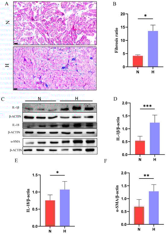 To evaluate diabetes-induced cardiac remodeling, Masson staining demonstrated a significant increase in the fibrosis area ratio in HFD hearts compared to that in control hearts (Figure 5A,B). Western blot analysis revealed marked upregulation of the pro-inflammatory cytokines IL-1β and IL-18 (Figure 5C–E), which mediate acute inflammatory responses and adaptive immunity, respectively. Dysregulated activation of these cytokines is closely associated with pathological cardiac injury. Furthermore, α-smooth muscle actin (α-SMA), a hallmark of myofibroblast activation, was significantly elevated in the H group (Figure 5F), directly driving fibrosis progression by enhancing contractility and extracellular matrix (ECM) secretion. Collectively, these results confirmed that T2DM exacerbates inflammatory responses and fibrotic remodeling in zebrafish hearts.