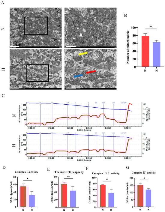 Mitochondria are the primary energy-producing organelles in cardiomyocytes and are critically linked to cardiac health. TEM revealed structural abnormalities in the hearts of the H group, including reduced mitochondrial density, cristae loss, swelling, and membrane disruption (Figure 6A). Mitochondrial respiratory chain activity, assessed via high-resolution respirometry, demonstrated diminished complex I, complex I + II, ETCmax, and complex IV activities in the H group (Figure 6C–G), confirming functional impairment.