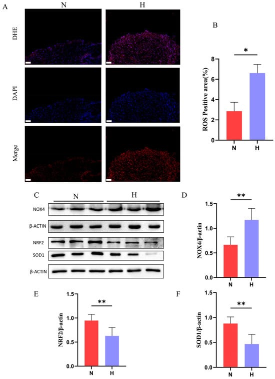 As the principal source of ROS, mitochondrial dysfunction exacerbates oxidative stress. Although physiological ROS levels regulate cellular signaling, excessive ROS production drives oxidative damage, senescence, apoptosis, and disease pathogenesis [26]. DHE staining revealed significantly increased ROS-positive areas in the hearts of the H group (Figure 7A,B). Molecular analyses further showed an elevated expression of NADPH oxidase 4 (NOX4), a key ROS-generating enzyme, along with suppressed antioxidant defenses, marked by downregulated NRF2 and SOD1 protein levels in the H group (Figure 7C–F). Collectively, these findings demonstrate that T2DM disrupts mitochondrial architecture and bioenergetics, while inducing a redox imbalance in zebrafish hearts.