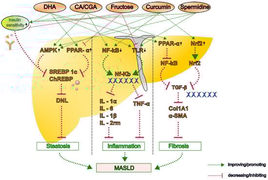 The proposed molecular mechanisms by which key dietary bioactive compounds influence the pathogenesis of metabolic dysfunction-associated steatotic liver disease (MASLD). Representative compounds—including caffeine, chlorogenic acid (CGA), polyphenols (curcumin, resveratrol, and silymarin), omega-3 polyunsaturated fatty acids (PUFAs), and polyamines (spermidine and putrescine)—modulate lipid metabolism, oxidative stress, inflammation, and fibrogenesis through multiple pathways. Upward arrow denotes an increase or upregulation and the downward arrow indicates decrease or downregulation in the activity or expression. α-SMA, alpha-smooth muscle actin; AMPK, AMP-activated protein kinase; CA, caffeine; CGA, chlorogenic acid; ChREBP, carbohydrate-responsive element-binding protein; Col1A1, collagen type I alpha 1; DHA, docosahexaenoic acid; DNL, de novo lipogenesis; IL, interleukin; NF-κB, nuclear factor kappa B; Nrf2, nuclear factor erythroid 2-related factor 2; PPAR, peroxisome proliferator-activated receptor; SREBP-1c, sterol regulatory element-binding protein 1c; TGF, transforming growth factor; TLR, toll-like receptor; TNF, tumor necrosis factor.
