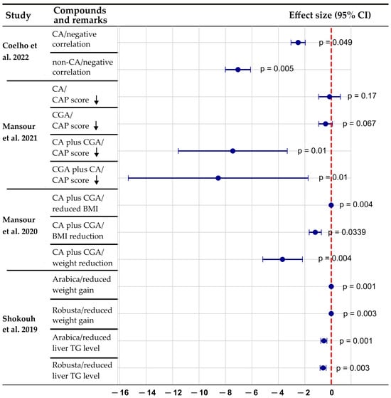 A forest plot of the association between coffee components and MASLD parameters. Negative values indicate the beneficial effects of coffee/caffeine and chlorogenic acid on MASLD parameters. The combination of caffeine plus chlorogenic acid appears to have stronger effects than either component alone. Both robusta and arabica coffee varieties show significant benefits for liver triglyceride levels and weight reduction. p-values displayed on the right side of each data point indicate statistical significance of the observed effects, with values < 0.05 considered statistically significant. Data compiled from Coelho et al. (2022) [69], who reported negative correlations between fatty liver index and caffeine metabolites (p = 0.049, p = 0.005); Mansour et al. (2021) [70], who demonstrated effects of caffeine and chlorogenic acid on controlled attenuation parameter scores (p values ranging from 0.01 to 0.17); Mansour et al. (2020) [71], who showed significant BMI and weight reduction with caffeine plus chlorogenic acid supplementation (p = 0.004, p = 0.0339); and Shokouh et al. (2019) [72], who documented reduced liver triglyceride levels and weight gain with both arabica and robusta coffee varieties (p values ranging from 0.001 to 0.003). Downward arrow indicates a decrease of CAP score. BMI, body mass index; CA, caffeine; CAP, controlled attenuation parameter; CGA, chlorogenic acid; TG, triglyceride.